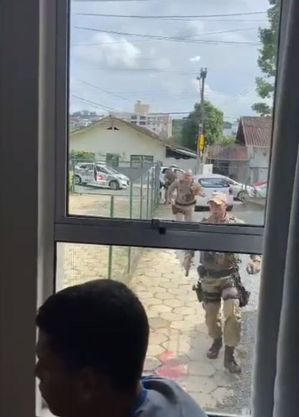 Um vídeo mostra o momento em que os agentes da polícia chegam ao local, preparados para averiguar a veracidade das informações de um possível novo ataque na cidade. Os alunos ficam assustados e permanecem dentro das salas de aula.